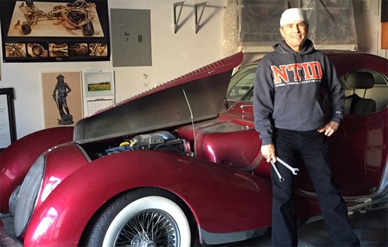 Henry Navas ’74, ’77 takes a break from working on his reproduction of a 1936 Talbo-Lago, just one of his many hobbies and interests.