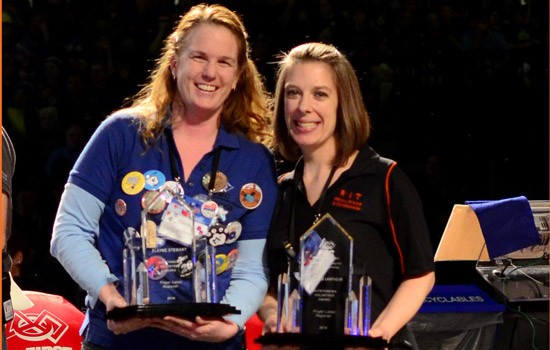 At the recent FIRST Robotics Regional competition, judge adviser Elayne Stewart, left, and event coordinator Michelle Lanphear were recognized as Volunteers of the Year for their contributions to the planning and logistics of the event.