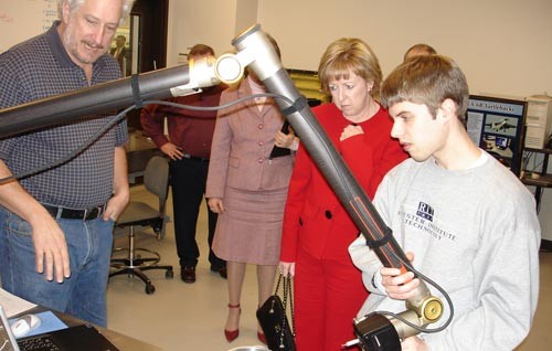 RIT professor Raymond Grosshans and student Zachary Mott demonstrate a sustainability research project to Monroe County Executive Maggie Brooks during a recent tour.
