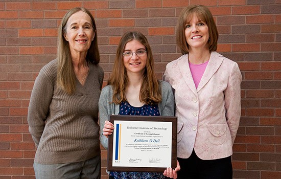 Scouten Intern Katie O’Dell, center, joins RIT/NTID faculty members Kathleen Eilers-Crandall, left, and Kathy Varone.