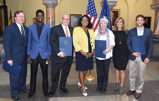 Gerry Buckley, RIT vice president and dean, and NTID president, far left, accepted a proclamation Monday from Rochester Mayor Lovely Warren in celebration of International Deaf Awareness Week. Also in attendance were, from left to right after Buckley, Ahmed Mahmoud, president, Junior National Association of the Deaf, Rochester School for the Deaf; Antony McLetchie, superintendent and CEO, Rochester School for the Deaf; Warren; Candi Daviton, president, Deaf Women of Rochester; Elaine Spaull, councilmember, City of Rochester; and David Justice, International Programs Director and co-founder, Discovering Deaf Worlds.