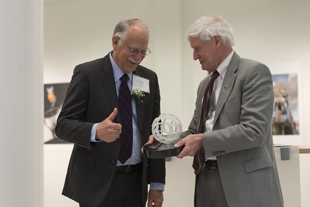 Charles Hull, left, the co-founder and chief technology officer of 3D Systems and widely considered the âfather of 3D printing,â receives the Melbert B. Cary Jr. Award from RIT President Bill Destler during an April 21 dinner inside the University Gallery. Hull toured 3D printing and research centers with RIT faculty and students earlier in the day. The prestigious awardânamed in honor of Melbert B. Cary Jr., whose lifelong love and support of the graphic arts inspired othersâis presented to those who have distinguished themselves in the advancement of technology in graphic communications and related industries. -