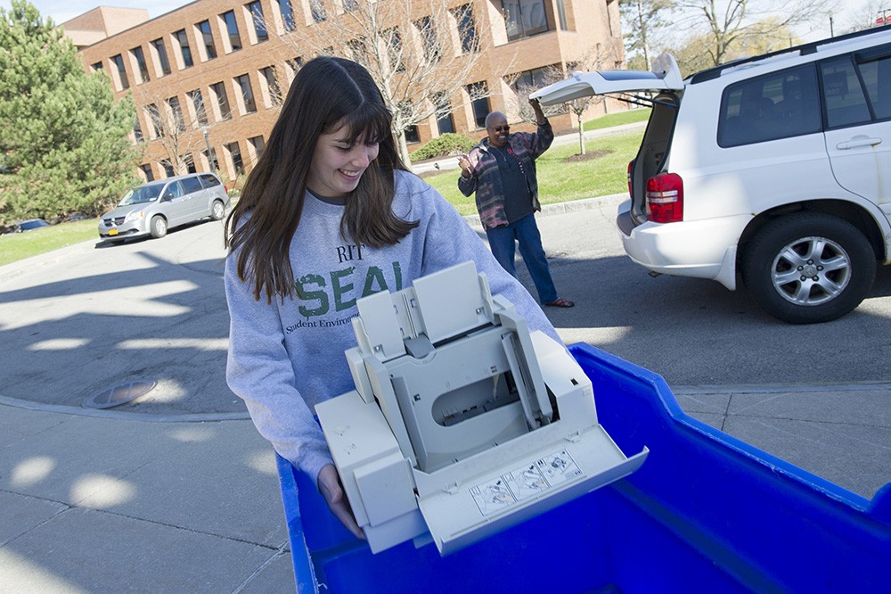 Third-year environmental science student Laura Denlinger from Suffern, N.Y. assisted during the 17th annual electronic recycling day April 21. The Student Environmental Action League (SEAL) organized the event and has recycled over 250 tons of electronics to date. -
