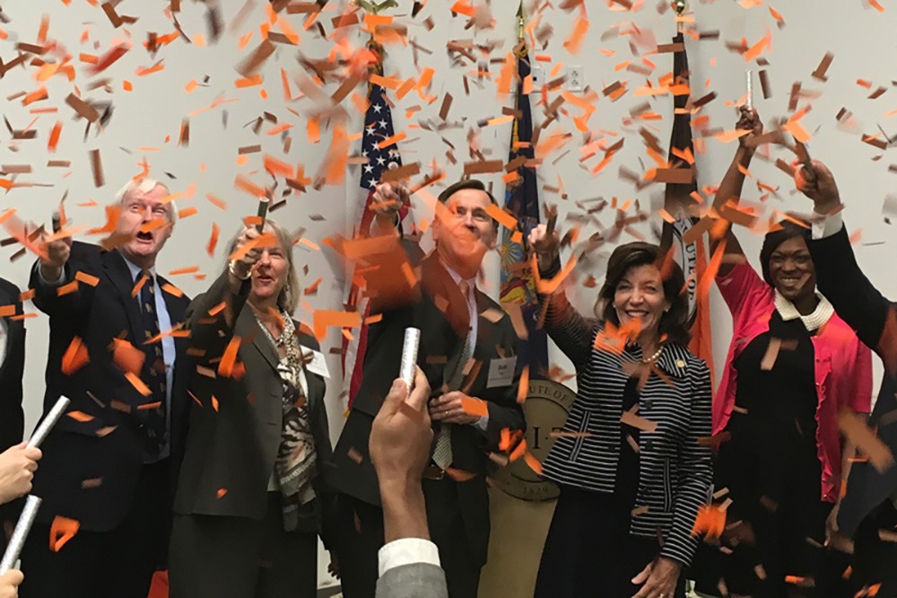 RIT President Bill Destler, left, Amy and Bob Tait, Lt. Gov. Kathy Hochul and CUE Interim Director Ebony Miller celebrate the grand opening of RITâs Center for Urban Entrepreneurship today in downtown Rochester. The center, known as CUE, is located in the RIT Downtown Center for Innovation and Entrepreneurship, in the heart of the cityâs downtown innovation zone and is working to help reshape the regional economy and build wealth within the urban community by being the hub for urban entrepreneurial programs and research. The building, constructed in 1927 and now on the U.S. National Register of Historic Places, was donated to RIT in 2012 by Rochester Historic Ventures, which is comprised of members of the Leenhouts, Tait, and Tones families, along with members of the Broadstone Real Estate management team. -
