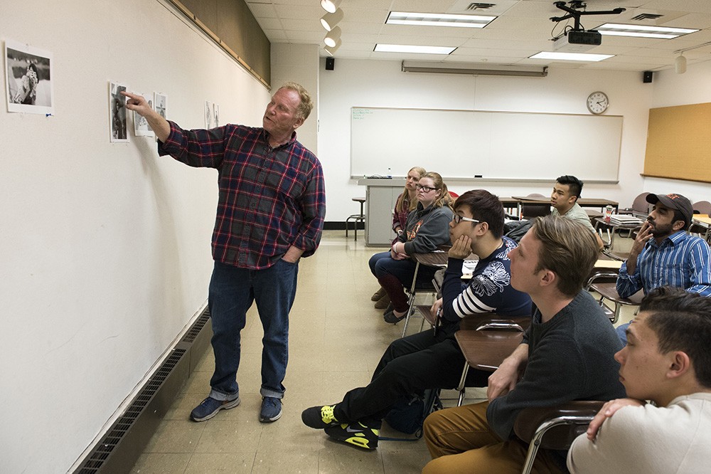 Associate Professor Dan Larkin leads a photography critique during his black and white photography class for non-majors. The elective course involves processing and printing black and white film from various assignments. -