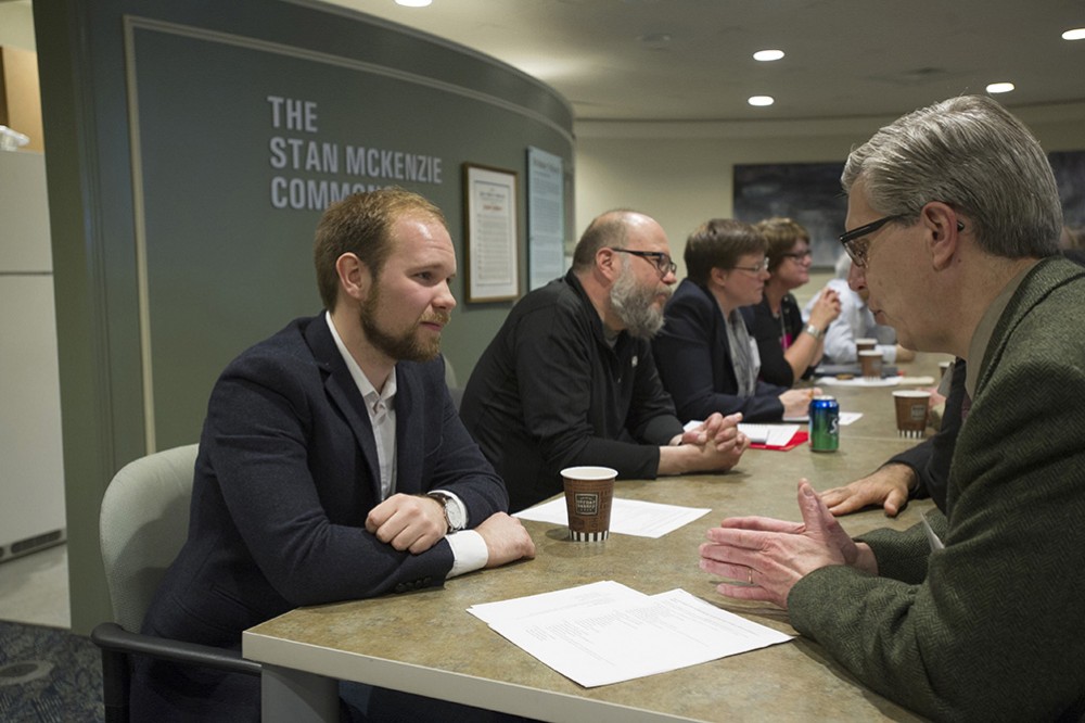 Visitors from Sweden's Malmo University are at RIT this week for academic presentations, labinars and tours. On left, Anton Tibblin, information architecture program leader at Malmo University, participated in a speed networking activity with Esa Rantanen, RIT associate professor in the department of psychology in the College of Liberal Arts. -