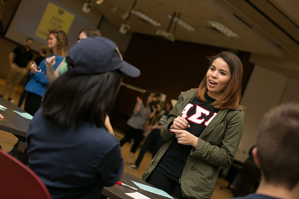 Students participated in an event, Deaf Deaf World, simulating an environment where everyone was deaf and used sign language and other visual communication. Tables were set up with different themes and activities. Here, biomedical science student Emylsie Huertas tried the Tiger Sports table.