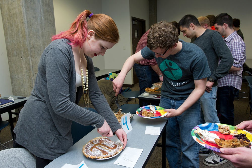 The RIT College of Science math club, PiRIT, celebrated Pi Day, 3/14, with a pie baking contest. Pi represents the ratio of the circumference of a circle to its diameter. The infinite number begins with 3.14159 and is a puzzle for those who try to pin it down. Here, Ellen Baillie served pie to a line of judging students. Baillie’s apple crumb pie won the contest.