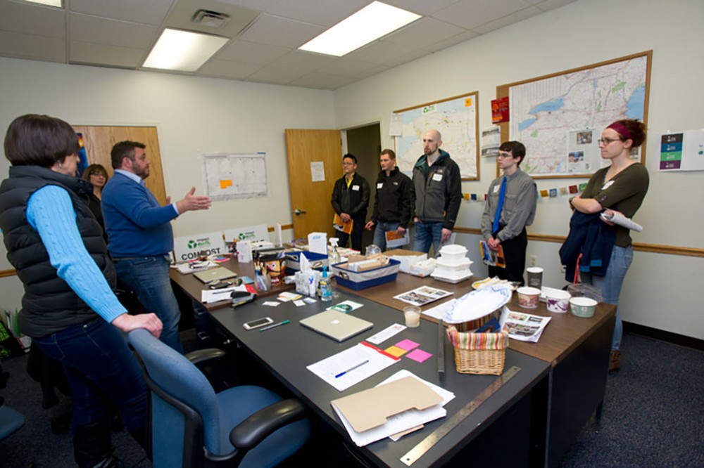RIT students toured RIT’s Venture Creations business incubator for an open house event March 15. Students were encouraged to network with representatives of the businesses working with Venture Creations and get more information on how to start their own businesses, or how Venture Creations can help them. Here, students learned about Impact Earth, a business focused on zero-waste solutions.