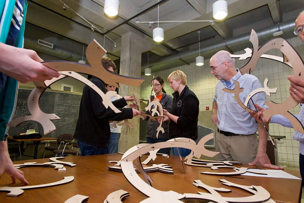 Sculptor and applied mathematician George Hart led a hands-on construction of geometric sculpture in the RIT College of Science on March 17 as part of the John Wiley Jones Distinguished lecture. Hart, far right, interdisciplinary research professor at Stony Brook University, co-founded the Museum of Mathematics in New York City.