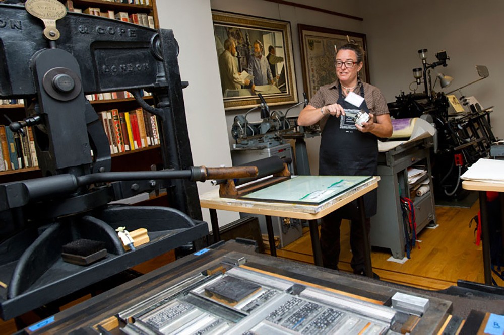 More than 100 printing professionals and enthusiasts came to RIT Oct. 22-24 for the 40th annual American Printing History Association conference. Hosted by RITâs Cary Graphic Arts Collection, the conference allowed participants to investigate the connection between hand-operated printing presses in use from the 15th to 19th centuries, and todayâs work in the history of the book and fine press printing. Attendees used some of the Cary Collectionâs 18 historical printing presses, including the Kelmscott/Goudy Albion iron hand press. Here, Marnie Powers-Torres, from the University of Utah Red Butte Press, demonstrates printing on the Kelmscott-Goudy press.