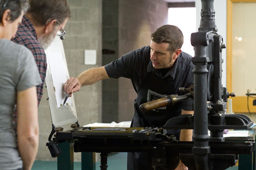 More than 100 printing professionals and enthusiasts came to RIT Oct. 22-24 for the 40th annual American Printing History Association conference. Hosted by RITâs Cary Graphic Arts Collection, the conference allowed participants to investigate the connection between hand-operated printing presses in use from the 15th to 19th centuries, and todayâs work in the history of the book and fine press printing. Attendees used some of the Cary Collectionâs 18 historical printing presses, including the Kelmscott/Goudy Albion iron hand press. Here, Chad Johnson, from the San Francisco Center for the Book, prints on an Albion press once owned by John DePol. -
