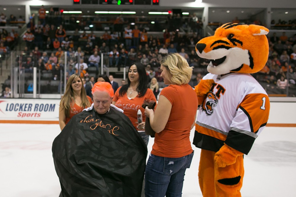 Stylists from Shear Global Salon put the final orange touches on President Bill Destlerâs hair Saturday night. Destler lived up to his promise to Tiger fans by dying his hair after a sellout crowd of 4,300 packed the Gene Polisseni Center. It was the first sellout in history for menâs hockey at the arena, which opened last year. -
