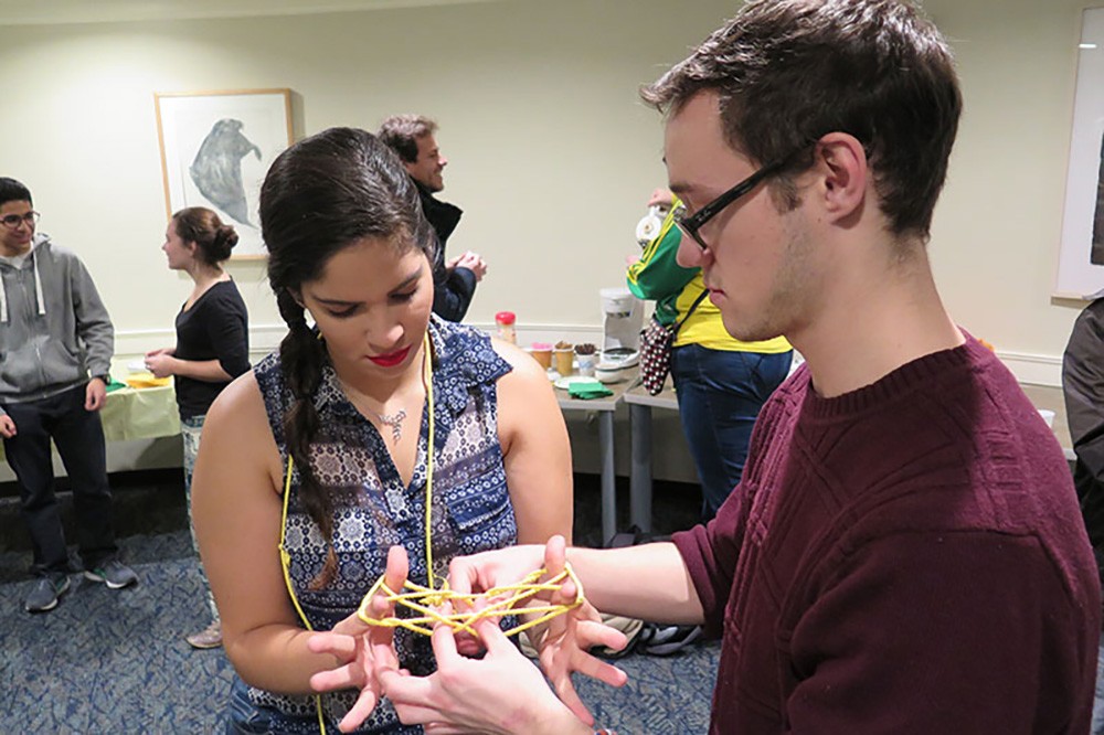 RIT students celebrated Brazilian Day on Oct. 29. The event was sponsored by the Department of Modern Languages and Culture in the College of Liberal Arts. Visitors learned about Brazilian culture and music, and the Portuguese language. Photography major Estefania M. Blanco, left, plays catâs cradle with Lennon Sulzbach, right, who is studying computer engineering technology. -