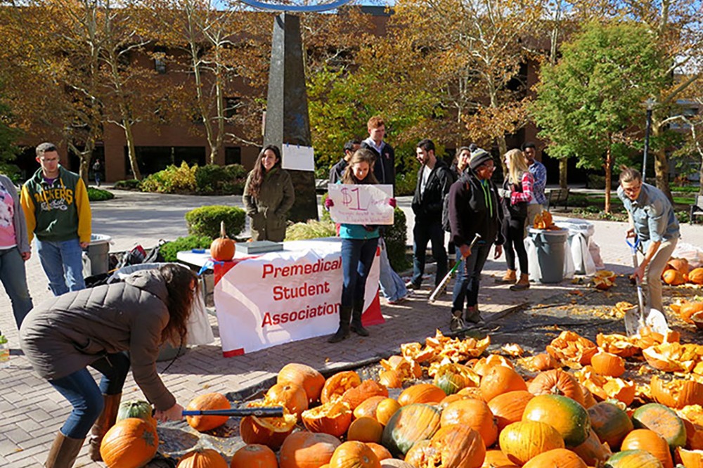 Ashley Murphy Shaw, a third-year biotechnology major, smashes a pumpkin at the Infinity Quad to benefit the Elizabeth Wende Breast Clinic. The fundraiser was hosted Oct. 30 by the RIT Pre-Health Student Association. -