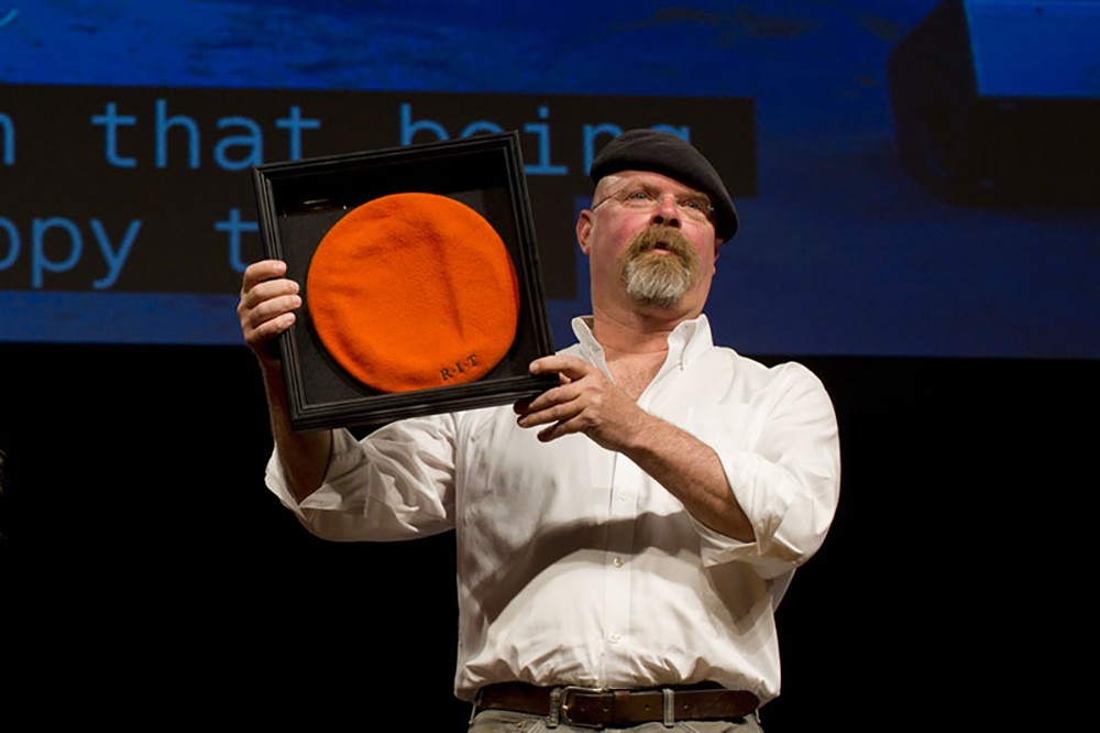 âMythbusterâ Jamie Hyneman, this yearâs Horton Distinguished Speaker for Brick City Homecoming & Family Weekend, spoke to a sold-out crowd in the Gordon Field House. He received an orange beret, embroidered with RIT, as a keepsake. -