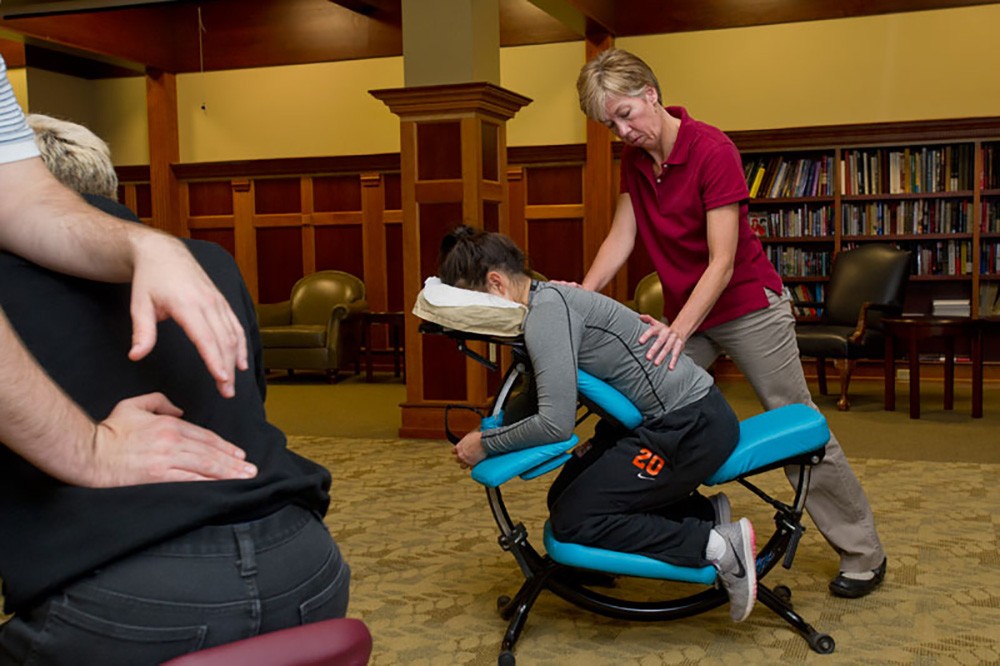 Commuter Spirit Week kicked-off Oct. 19. The Center for Campus Life sponsors a week full of activities, giveaways, food, and demonstrations from Oct. 19-23. Here, Kim Ross, from Peace Partners, gave 10-minute massages to students during one of the events. -