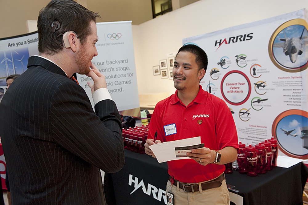 Representatives from more than 45 local and national corporations, federal agencies and nonprofit organizations met with nearly 400 deaf and hard-of-hearing studentsâwho are also prospective employeesâat the 15th annual job fair on Oct. 21 at RITâs National Technical Institute for the Deaf. Samuel Sandoval, right, a 2013 information technology graduate from Golisano College of Computing and Information Sciences, returned for the second time as a recruiter for Harris Corp. Here, he meets with Daniel Mooney, an information technology masterâs student from McLean, Va. -