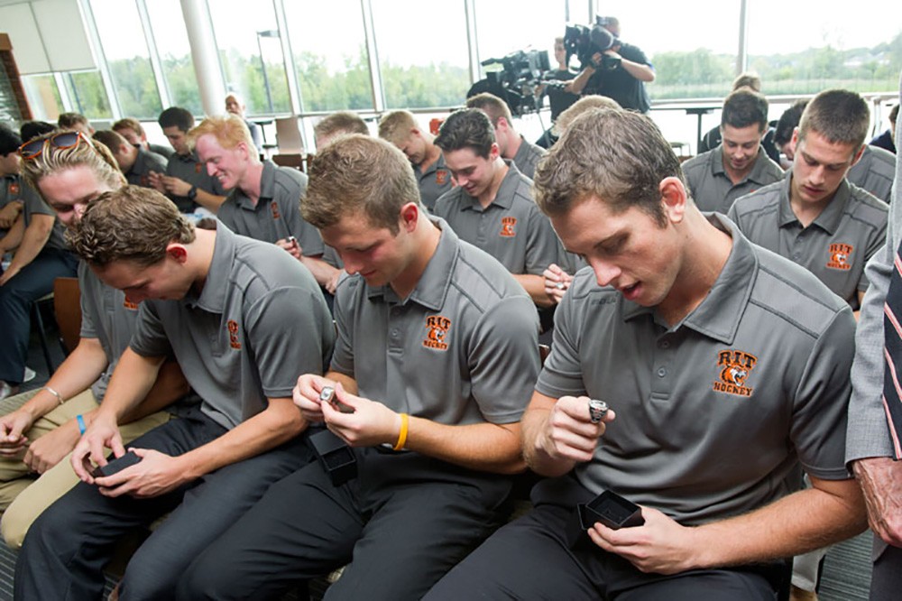Menâs hockey captains (from right) Alexander Kuqali, a fourth-year accounting student from Pittsburgh, PA; Andrew Miller, a fourth-year business management student from Chicago, IL; and Josh Mitchell, a fourth-year environmental science student from Osoyoos, BC; get their first look at the Atlantic Hockey Championship rings. The team was honored on Sept. 9 at the Gene Polisseni Center.