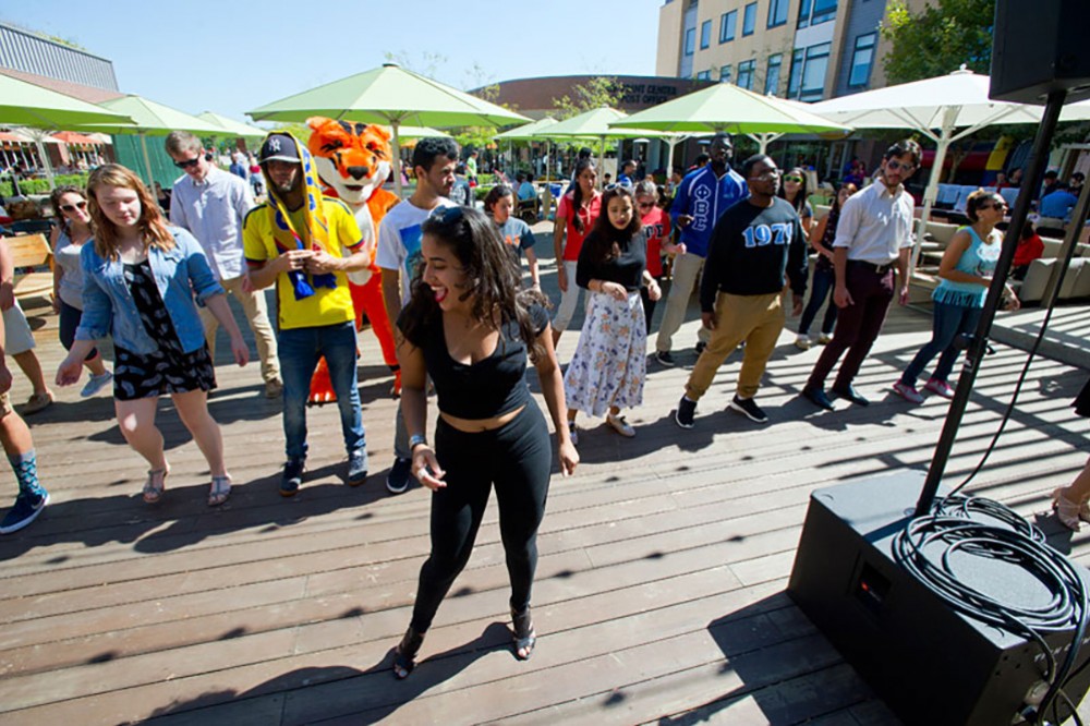 RIT kicked off Hispanic Heritage Month on Sept. 15 with food, music and dance in Global Village. The date coincides with the anniversary of independence for five Latin American countries. The celebrations culminate with a guest speaker to campus, Jackie Cruz, 6:30 p.m. on October 15 in Ingle Auditorium. Cruz is a Dominican-American actress known for her role in the series Orange Is the New Black. Here, Emily Prado, a third-year student in the Saunders College of Business from Boston, leads a group in a Latin dance lesson. -