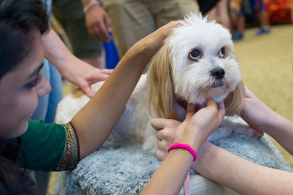 Certified therapy dogs with their owners provided a welcome break for RIT students in the Fireside Lounge. Here, Tulip, a Lhasa Apso, gets some attention from Khyati Vyas, a graduate student in computer science from India. The event was sponsored by the Center for Student Wellness as a stress reduction activity. Research indicates that pet therapy improves psychological well-being and self-esteem. -