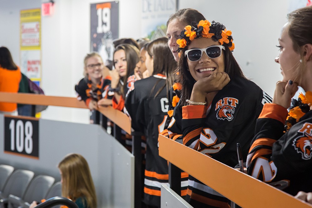 Victoria Pitawanakwat, a second-year international business major from Manitoulin Island, Ontario, soaks in the festive atmosphere at ALO-Hockey pep rally that kicked off the 2015-16 season for both the menâs and womenâs hockey programs. The women start the season with an exhibition contest against the Ottawa Lady Senators 7 p.m. Sept. 25 at the Gene Polisseni Center. Tickets are available at the Gene Polisseni Center Box Office. -