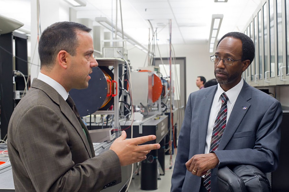 Don Figer, left, director of the Center for Detectors at RIT, talks with Clayton Turner â90 (electrical engineering). Turner, deputy director at NASAâs Langley Research Center, opened the 2015 Deanâs Alumni Speaker Series Sept. 24 in the the Kate Gleason College of Engineering. During his visit, Turner also met with students and toured the Center for Detectors. -