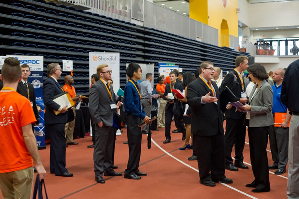 More than 250 companies and 4,000 students looking for employment attended the 2015 RIT Career Fair on Sept. 30. Here, students line up to speak with representatives from Boeing. -