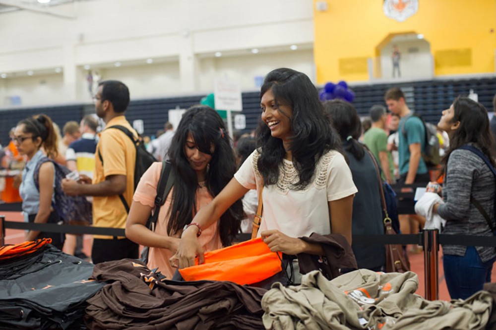 The Resource Fair, taking place from 9 a.m. to 6 p.m. Aug. 18 in the Gordon Field House, is a comprehensive event that allows new students and their families to get their questions answered, meet with staff members, take care of business, and get information regarding the resources and services available at RIT and in the community. This is also the location for all new students and families to check in for Orientation. Participating offices, departments and selected vendors include Registrar, Information and Technology Services, Dining Services, Student Financial Services, Financial Aid, and Parking and Transportation Services. From left, Swetha Iyer and Shweta Yakkali from India and first-year graduate students in the B. Thomas Golisano College of Computing and Information Sciences, pick up some RIT T-shirts. -