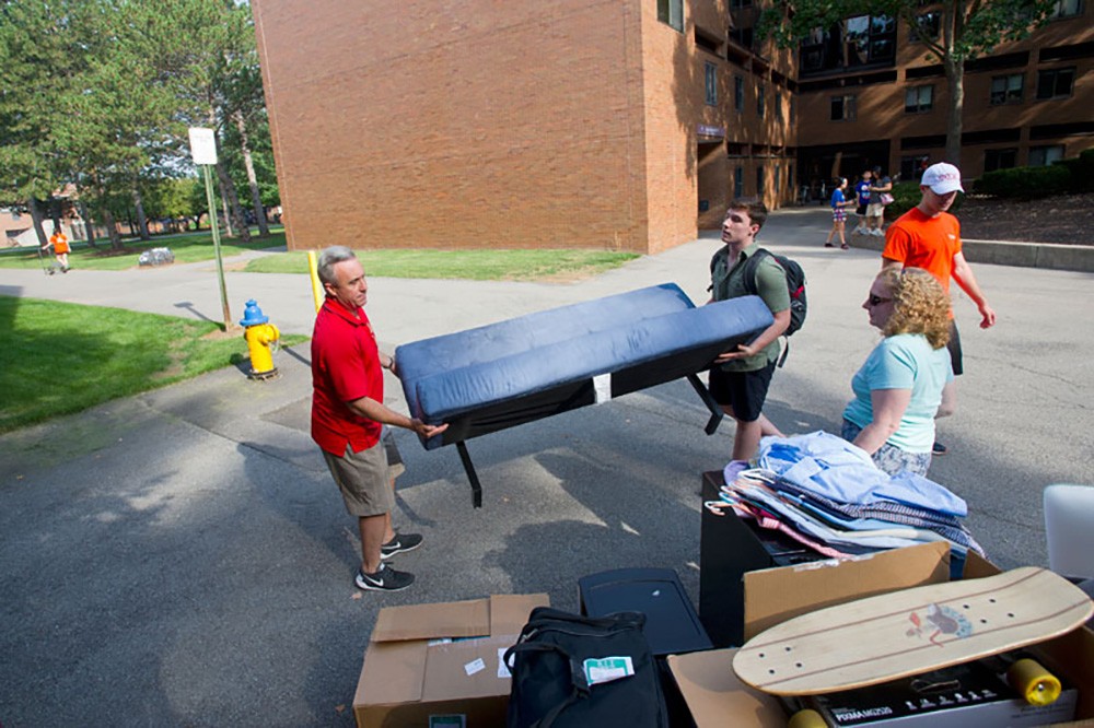 Gabriel Broderick, a first-year College of Science student from Marblehead, Mass., gets some help moving from his father, Michael. His mother, Theresa, right, is a 1984 and 1993 RIT alumna. More than 3,400 first-year and transfer students are expected to move into their dorms today. Returning students move in during the rest of the week, and classes begin Aug. 24. -