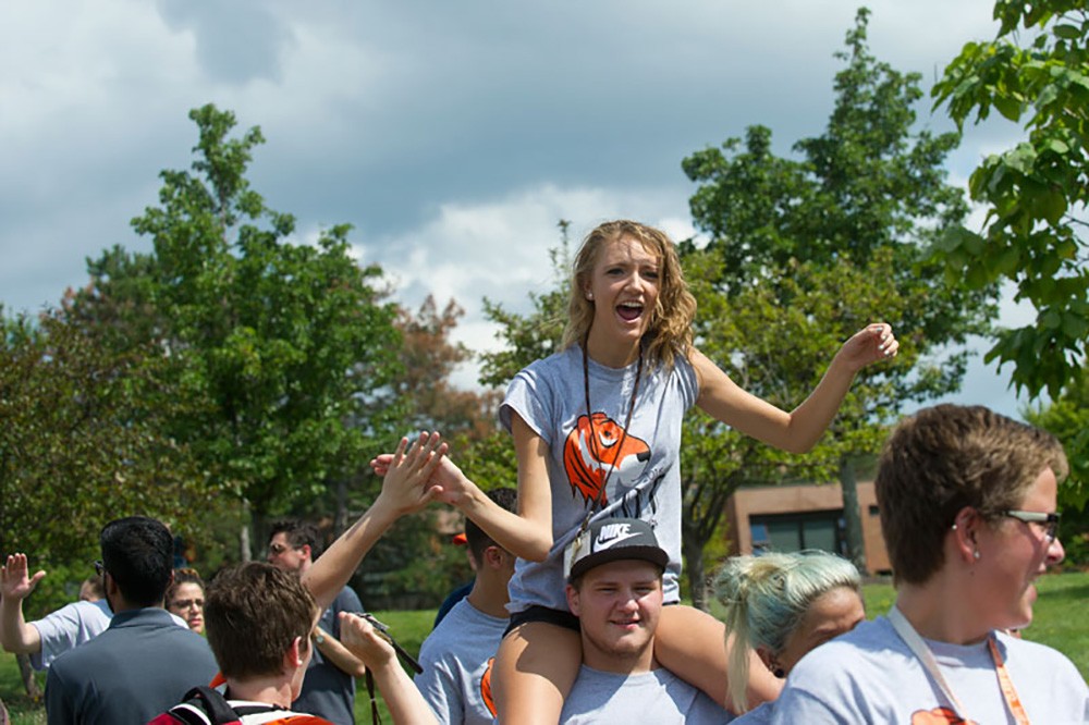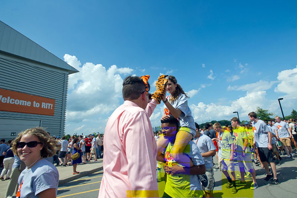 First-year students Georgina Buckingham and Ryan Ostler march in the Tiger Walk to the Convocation for New Students and Families in the Gordon Field House. A record 2,940 freshmen have enrolled this year. The new RIT Faculty & Staff Alumni Chapter co-hosted the event with the Center for Orientation & Transition and the Office of the Provost and Senior Vice President for Academic Affairs. There are more than 1,400 RIT alumni employed by the university that are a part of the new chapter. The alumni chapter will be coordinating special events and social activities in the future and picked Tiger Walk to kick off the academic year. -