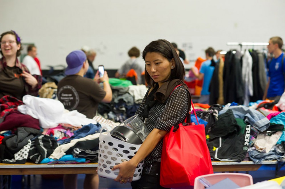 Tenzin Donzey, a Saunders College of Business graduate student from Tibet, peruses items in the inaugural Goodbye, Goodbuy! sale. The sale is the result of the collection of usable goods from students during spring move-out week. In total, 60,000 pounds of items, including clothing, food and housewares, were saved from landfills. The sale continues 10 a.m.â5 p.m. Aug. 18-22 in the Student Life Centerâs rear basketball courts. Hot items yesterday were furniture, lamps, refrigerators and storage bins. For more information, go to rit.edu/goodbyegoodbuy. -
