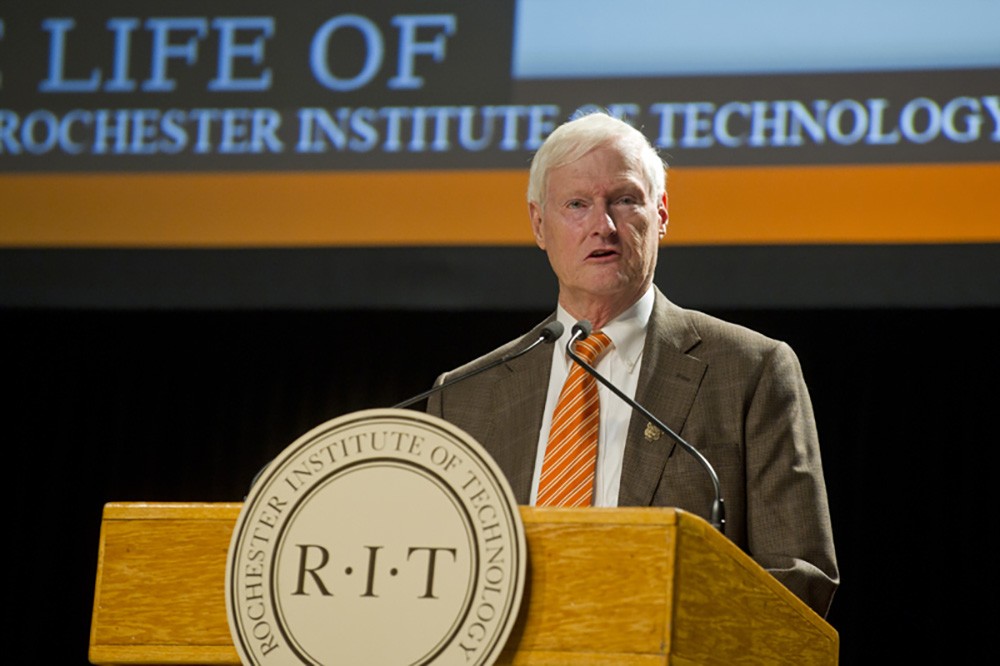 President Bill Destler welcomed back faculty and staff with his annual âAddress to the Communityâ on Aug. 21. Destler said RIT is âon the cusp of greatnessâ and cited record-high applications and enrollment, more research and private investment, and more opportunities for growth with the Clinical Health Sciences Center, MAGIC Spell Studios and the creation of an advanced manufacturing photonics center in Rochester. -