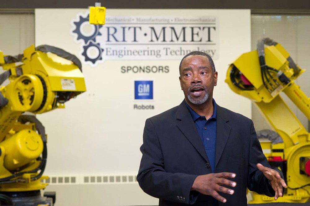 General Motors donated two heavy-duty industrial robots to RITâs College of Applied Science and Technology on July 22. Steve Finch, plant manager of GM-Tonawanda, participated in the dedication event, highlighting the prospects of RITâs students using the robots to learn more about next generation manufacturing and automation.