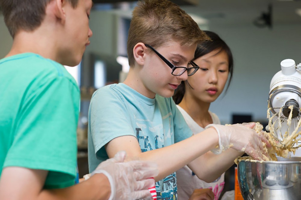 Middle-school students Kiernan Boland, left, Nick Burch, center, and Lia Donahue make a batch of chocolate chip cookies during the Bioscience Camp for Kids, âChemistry in My Cookies?â. The camp was held from July 20 to 24 at RITâs Center for Bioscience Education and Technology in the Institute for Health Sciences and Technology. -
