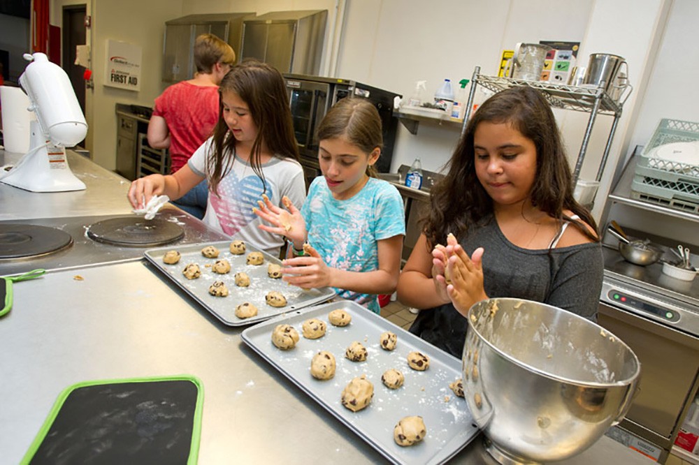 Middle-school students Jasmine Nichols, left, Tessa Brown, center, and Ariely Cortes make a batch of chocolate chip cookies during the Bioscience Camp for Kids, âChemistry in My Cookies?â. Instructor Lisa Zeller, in the background, checks the oven. The camp was held from July 20 to 24 at RITâs Center for Bioscience Education and Technology in the Institute for Health Sciences and Technology. -