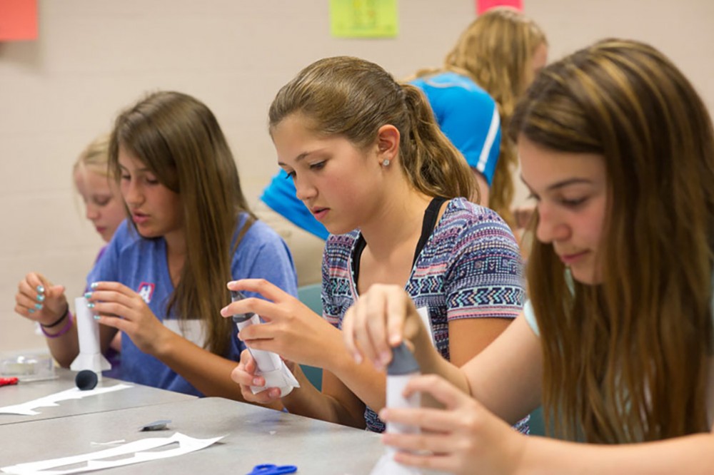 Area girls enjoyed the excitement of the Alka-Seltzer Blast design activity at the recent Everyday Engineering Camp. The activity is a mini-rocket launch using film canisters, alka seltzer tablets, water and a fuselage that the girls make and decorate. They also will measure the angle and height of the launch as a way to understand the basics of aeronautic engineering. Hosted by RITâs Women in Engineering program, the 7-9th graders will be onsite all week in the Kate Gleason College of Engineering, working with RIT female engineering students, faculty and teachers from regional high schools. From left, Ellie Fairchild, Claire Yioulos, Maddy Marcus and Olivia Schaefer work on their rockets. -