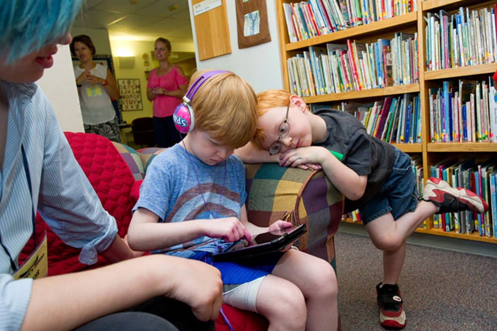 A team of RIT students, under the direction of RITâs Center for MAGIC and in collaboration with the Global Literacy Project, developed a tablet-based educational game to teach children around the world to read. Youngsters from Margaretâs House play tested the game to help the RIT students gather feedback on their product. From left, RIT student Jacob Westerback observed Ethan Koon and Ryan Heckman playing the game. -