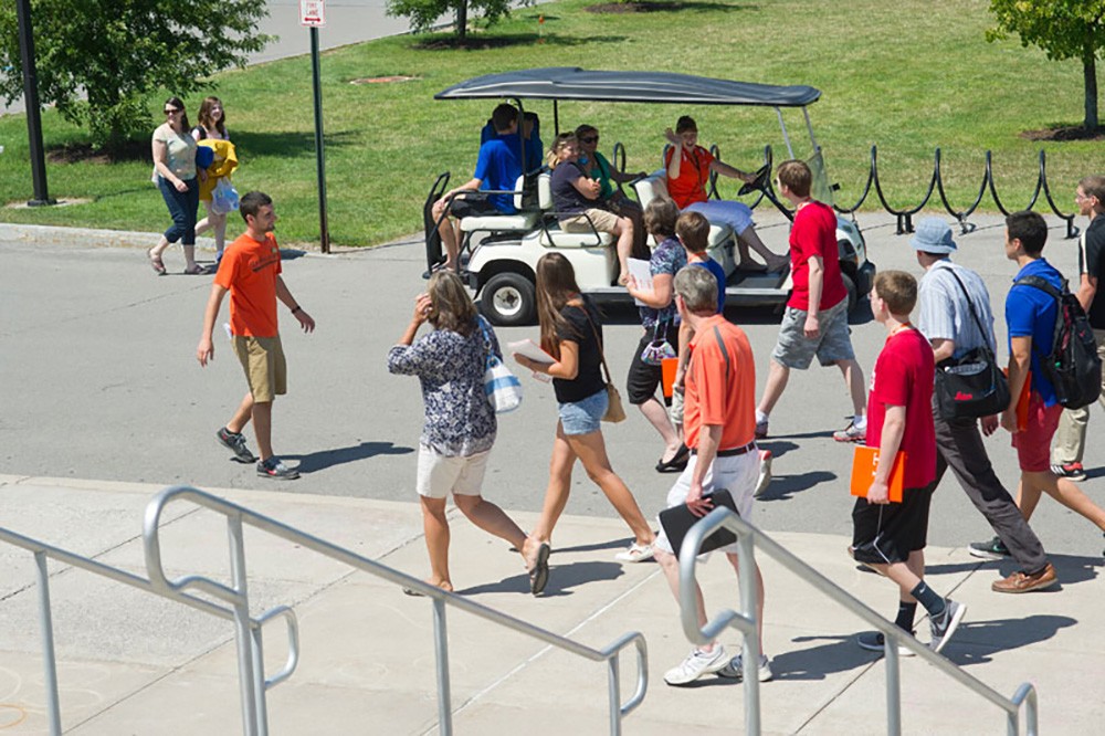 Third-year industrial design student Taylor Clow, left, led a group of prospective students and parents around campus on July 24 during RITâs 25th annual College & Careers program. Students entering their senior year of high school tour campus and the residence halls and take workshops on the types of programs RIT offers. The next program is offered Aug. 7-8. -