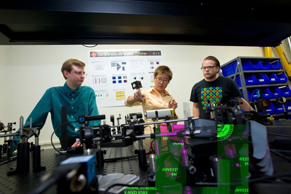 Research assistant Aaron Schweinsberg, left, associate professor Jie Qiao and fourth-year imaging science student Zachary Mulhollan experiment with a new kind of wavefront sensor in the Laboratory for Advanced Optical Fabrication, Instrumentation and Metrology in RITâs Chester F. Carlson Center for Imaging Science. Research conducted in the lab helps to advance optics hardware. -