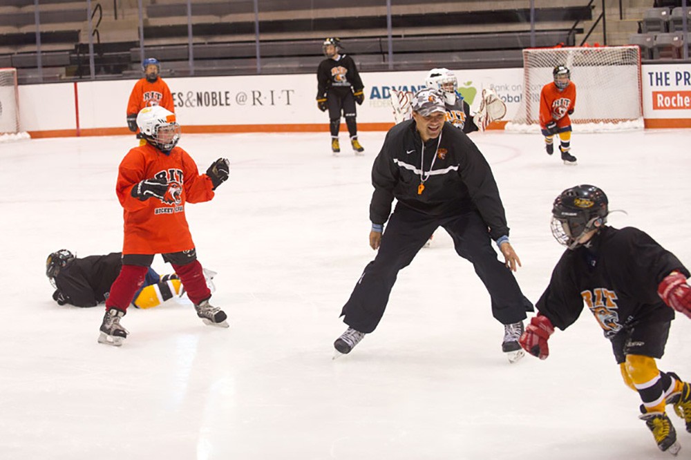 RIT assistant coach Dave Insalaco instructed youth players at the Tiger Hockey School held at the Gene Polisseni Center this week. Boys and girls tested out a big-time arena in the schoolâs 16th year of operation. -