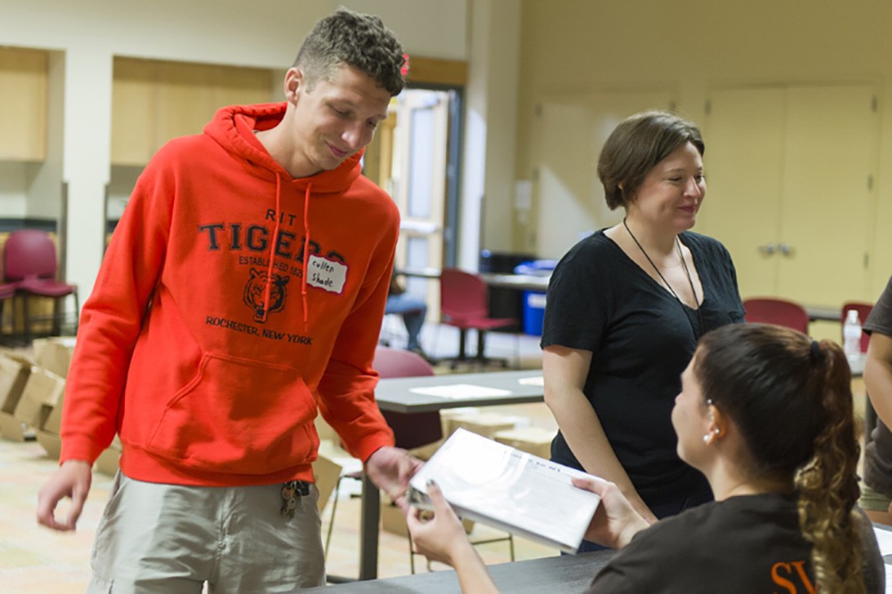 Cullen Shade of Whiting, Ind., already wearing his Tiger Pride, checks in for NTIDâs Summer Vestibule Program on Aug. 11. SVP provides first-year and transfer students with classroom and social experiences prior to the beginning of classes. -