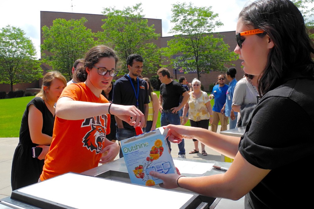 Missy Hall, a sustainable systems graduate student, receives ice cream from Hannah Koon of Brick City Catering. The ice cream social was held June 18 to thank the RIT community for another successful Imagine RIT festival. The festival was recently named the 2015 Best Kid-Friendly Festival in Rochester by KidsOutandAbout.com.