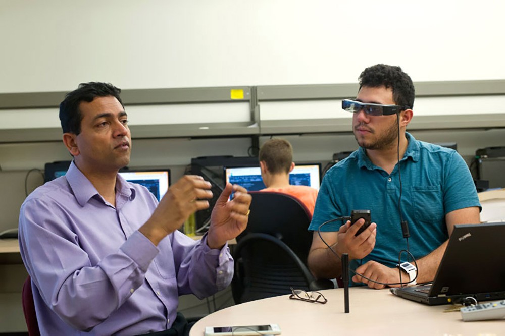 RIT assistant professor Raja Kushalnagar, left, and Victor Ortiz, a computer science student from New York City, discuss the applications of smart glasses for accessibility. An RIT/NTID National Science Foundation grant brought hearing, deaf and hard-of-hearing students from all over the country together to conduct research on the use of computers for enhancing accessibility to learning for people with sensory disabilities. -