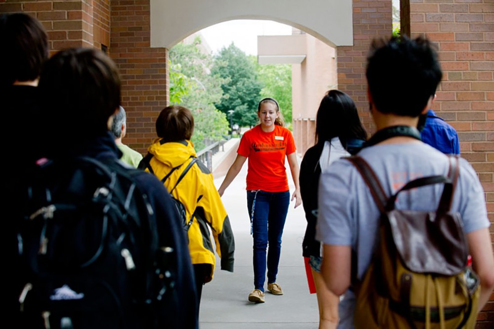 Kristen Hennessey, a fifth-year industrial and systems engineering student, gives a walking tour of campus facilities to visitors. The hour-long tour is offered Monday through Friday at various times. -