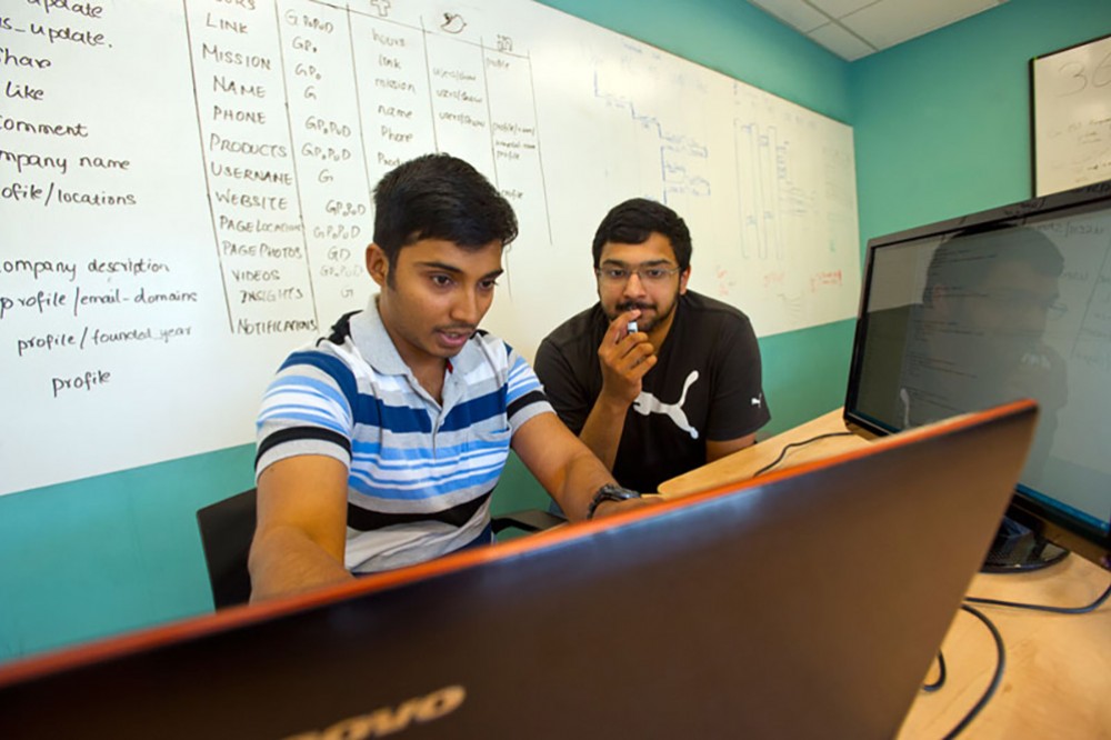 Krishna Prasad, left, a graduate student in computer science at RIT, and Nikhil Urval, a fourth-year student in computer science at Illinois Institute of Technology, are getting ready to launch Myspiderweb.com, a simple tool for users to quickly communicate across social networking services. They are one of eight teams of entrepreneurs in the Saunders Summer Startup Programâwhere young innovators form interdisciplinary teams to start real companies. Hosted by Saunders College of Business and the Simone Center for Student Innovation and Entrepreneurship, the summer program culminates with âInvestor Nightâ on Aug. 12 at RITâs Student Innovation Hall. -