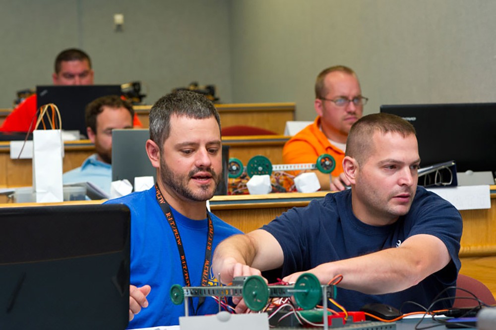 Ben Grieco, left, a teacher at Queensbury High School (Queensbury, N.Y.), and Mike Stolt, a teacher at Warwick Valley High School (Warwick, N.Y.), participated in a two-week class on computer integrated manufacturing during Project Lead the Way at RIT. PLTW provides training for teachers in the engineering disciplines and the opportunity to earn undergraduate credits. -
