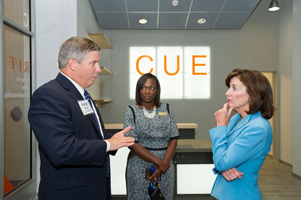 From left, Vice President for Research and Associate Provost Ryne Raffaelle and Program Manager for the Center for Urban Entrepreneurship (CUE) Ebony Miller gave Lieutenant Governor Kathy Hochul a tour of the facilityâs new space. The center is located in an historic building in downtown Rochesterâs business district. -