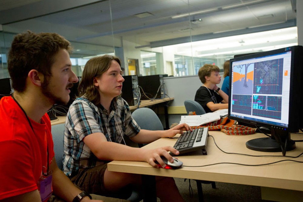 Will Wells, right, a senior at Pittsford Sutherland High School, develops a map for gaming during Kids on Campus. Hundreds of students in grades 5-12 are attending one or two weeks of STEM-based day camps on the RIT campus. The goal is to teach students subjects that will inspire them to think about possible careers involving that subject. With him is camp instructor Mitch Dehond, left, of Gates, N.Y., who attended Kids on Campus for seven years before attending RIT, where heâs currently an industrial design major. -