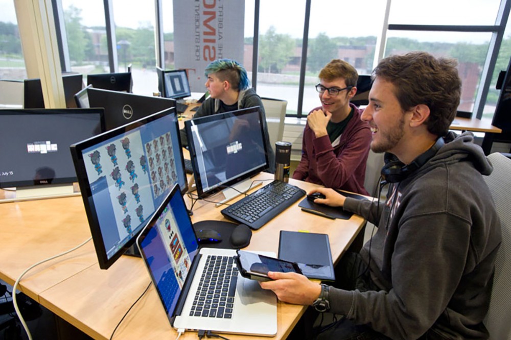Game design and development majors Jacob Westerback (left), Kyle Zarnoch and David Amata work to create Remy and the Book of Rhymes, a video game to help children learn to read. The team is working throughout the summer to bring their game to life, as part of the new Co-Up program. The MAGIC Center and Simone Center initiative allows students to earn cooperative education experience while working on projects that lead to start-up products and commercial activities. -